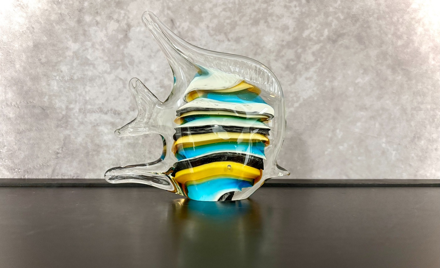A sleek fusion of art and nature. This handcrafted glass fish features vibrant swirls of aqua, and tangerine tones that shimmer beautifully in the light. Ideal as a decorative accent or thoughtful gift for art and ocean lovers.