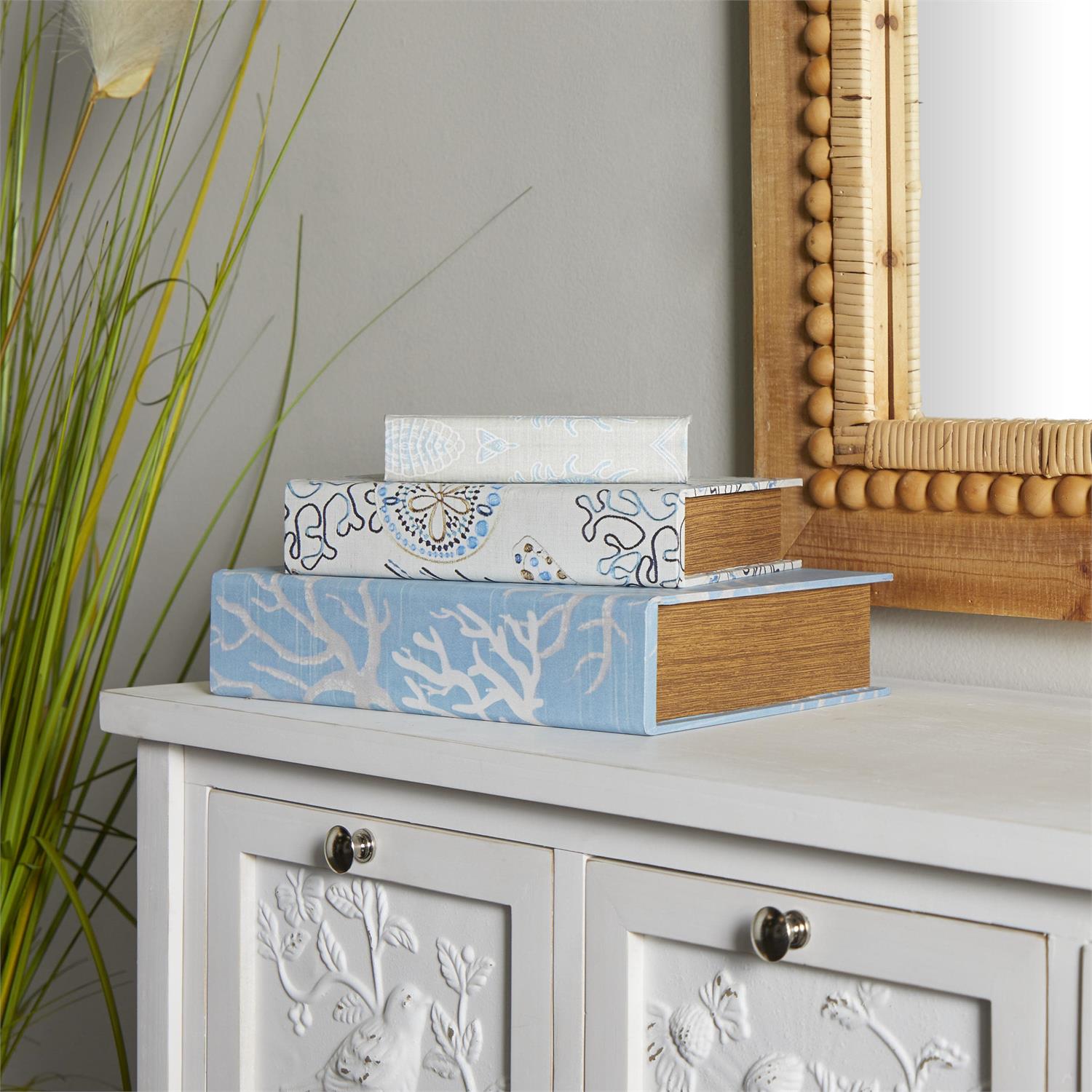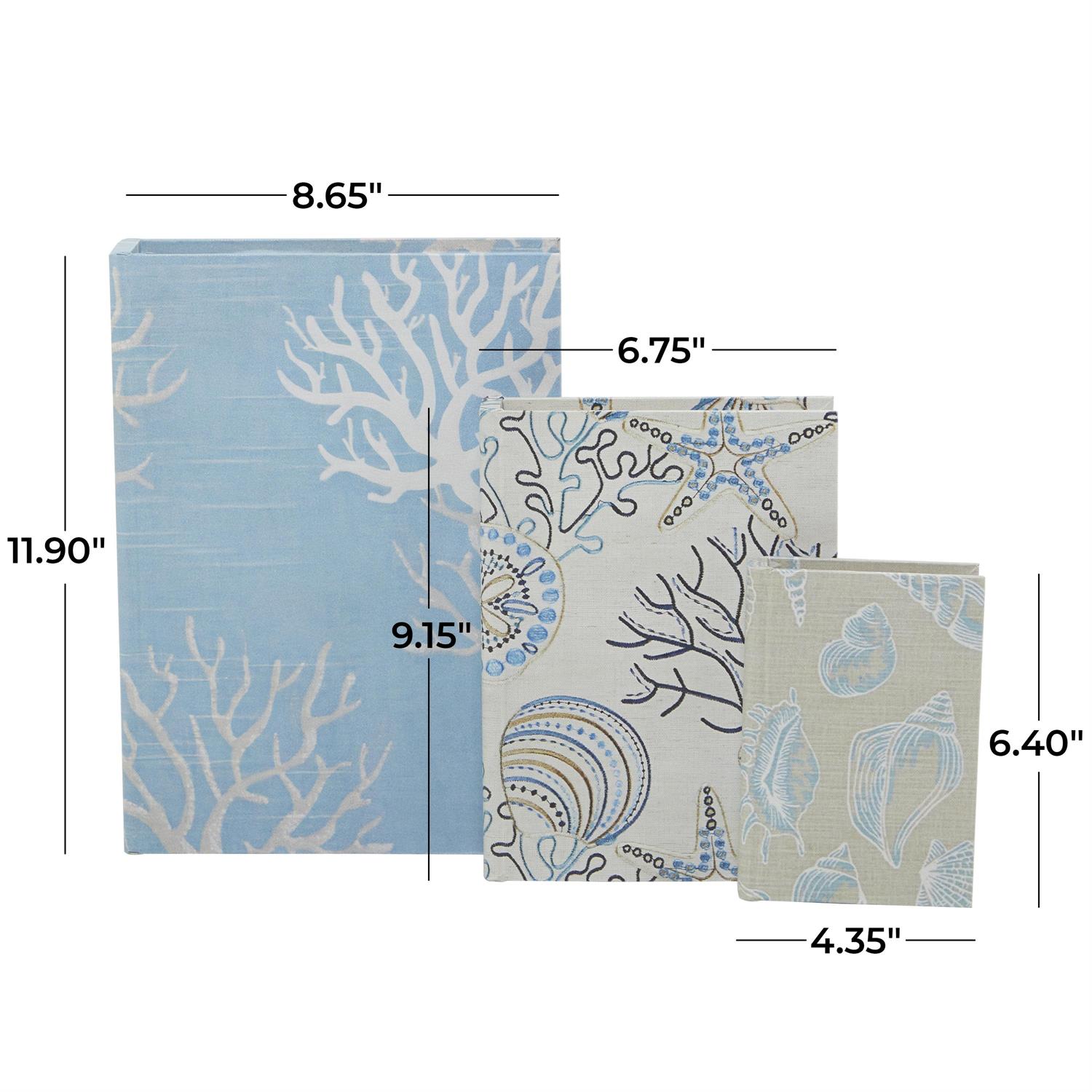 This set of 3 coastal themed book boxes features hidden storage compartments in various sizes, perfect for organization or as fillers on bookcases and shelves.