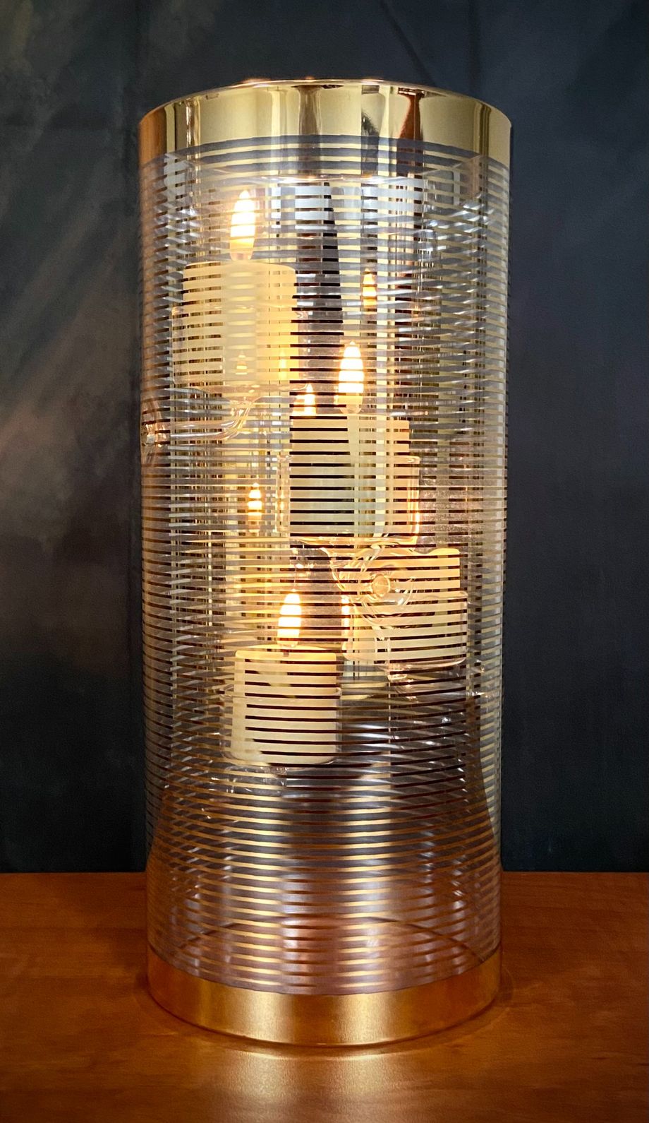 The Fairfax glass votive holder features metallic gold pinstriping, contrasted by gold bands at top and base. This unique piece has fixed interior brackets that hold 4 votive candles and is narrow enough to fit on a mantel.
