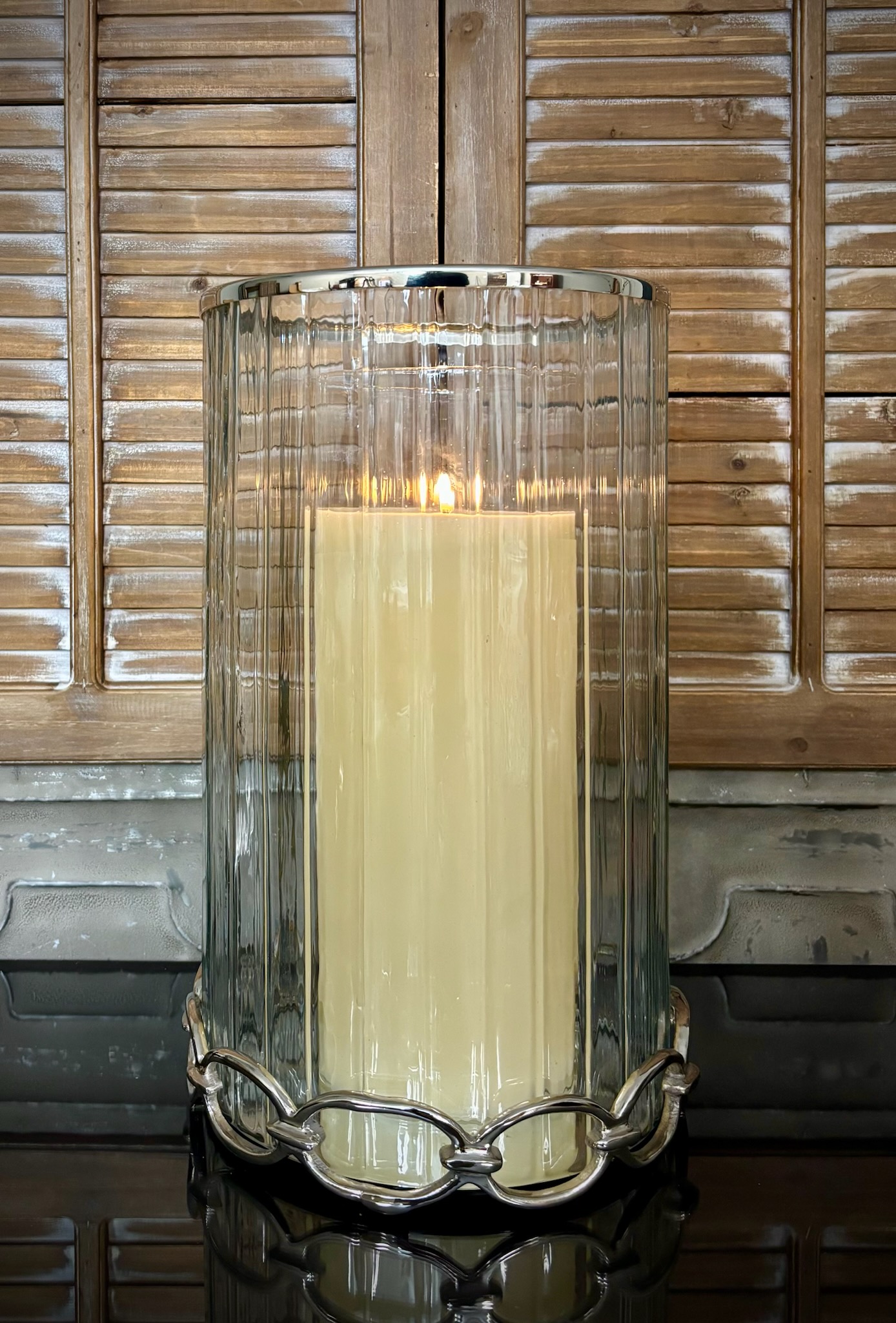 Elevate your décor with this stunning nickel and glass hurricane. Crafted with a sleek, polished nickel base and elegant glass hurricane, it reflects light beautifully, adding a touch of sophistication to any space. Perfect for creating a warm, inviting ambiance-don’t miss out on this timeless blend of luxury and charm.