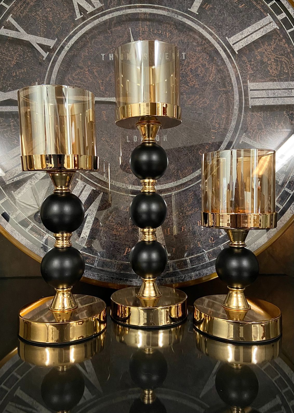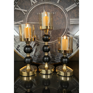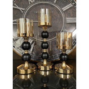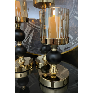 The Nora candlesticks bring an air of sophistication to any space. The bold black and gold finish adds a touch of glamour, while the glass hurricanes diffuse a warm, inviting glow.