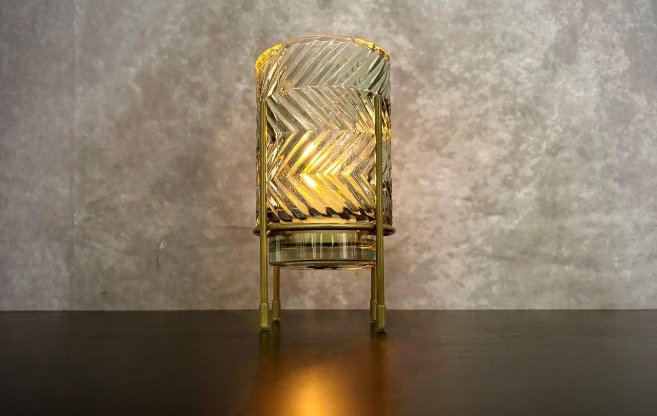 Add depth and drama to your décor with this stunning smoky grey candle holder. The cylindrical, patterned glass casts a gentle, atmospheric glow, while the brushed gold stand provides a sleek contrast. Perfect for modern interiors or evening gatherings, it brings a touch of sophistication to any setting.