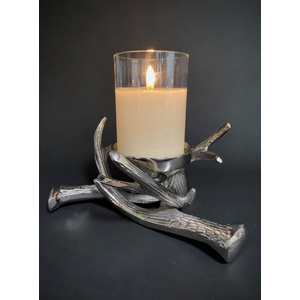 Aluminum candle holder features an inverted antler base and a round rim, adding unique charm