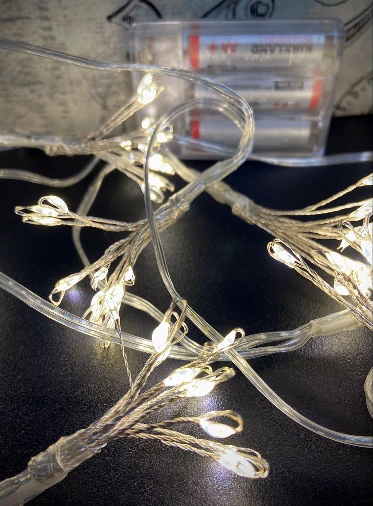 Whymsical cluster of Light creating a beautiful starburst effect. Features: The clear strand, silver wire and warm white LEDS.