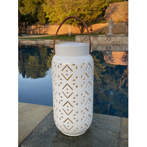 This pre-lit ceramic lantern features a delicate cut-out design that casts a unique light pattern when illuminated. The saddle brown leather handle and glazed finish are wonderful details that elevate these unique lighting elements. Perfect grouped together in a hanging display, adorning a tabletop or lining a pathway.