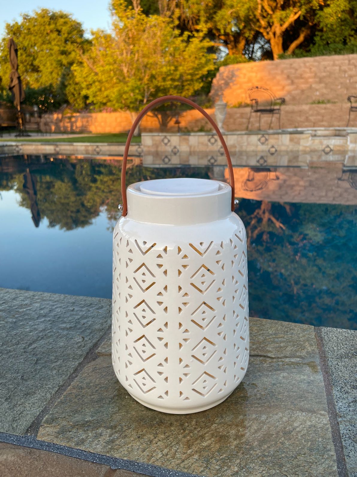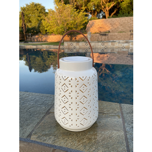 his pre-lit ceramic lantern features a delicate cut-out design that casts a unique light pattern when illuminated. The saddle brown leather handle and glazed finish are wonderful details that elevate these unique lighting elements. Perfect grouped together in a hanging display, adorning a tabletop or lining a pathway.