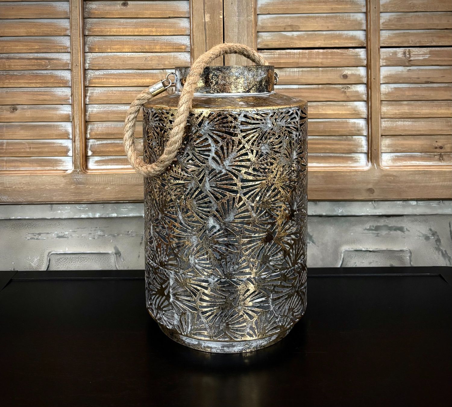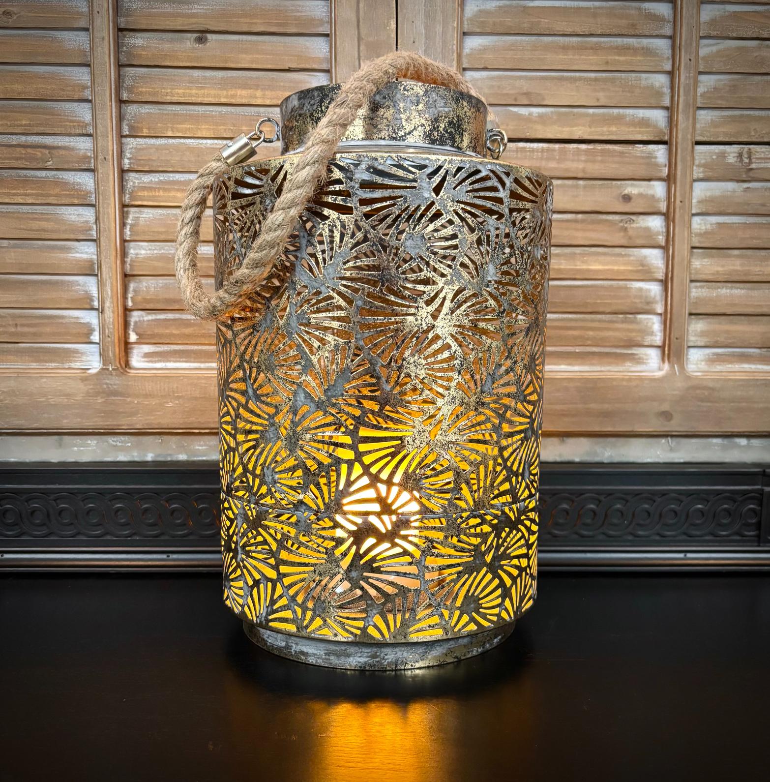 The Coastal Canopy Lantern brings together warm bronze metal, an elegant leaf detail, and a textured rope handle for a naturally inspired coastal look. When lit, the leaf motif creates soft, ambient shadows that add depth and warmth to any space. Perfect for patios, porches, or indoor décor, this lantern offers a relaxed yet refined accent inspired by seaside living.