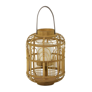 11″W x 15″H WICKER LANTERN Bamboo, faux leather, and glass give this lantern candle holder a solid and durable form This bamboo candle holder features a chocolate brown faux leather strap, a clear glass holder, and a tan bamboo lantern body.