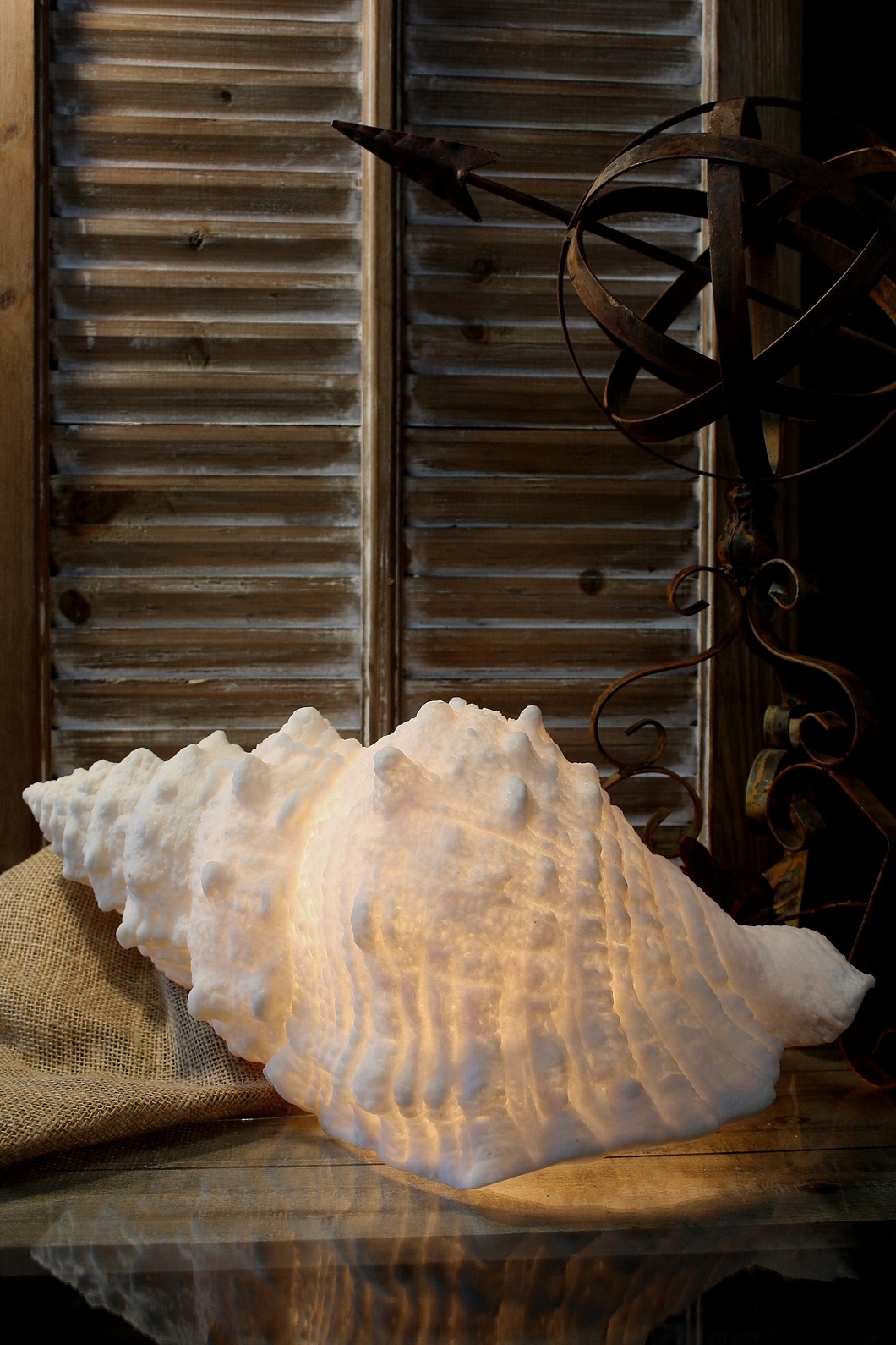 This unique small conch shell lamp is made of a combination of poly resin, fiberglass and sandstone. The casting materials used are formulated to give each creation a natural sun bleached and wave tumbled color and finish.