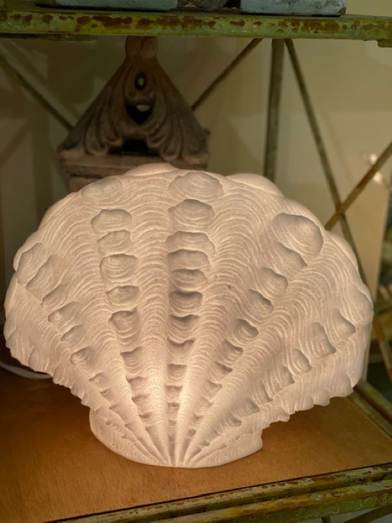 This unique large standing scallop lamp is made of a combination of poly resin, fiberglass and sandstone. The casting materials used are formulated to give each creation a natural sun bleached and wave tumbled color and finish.