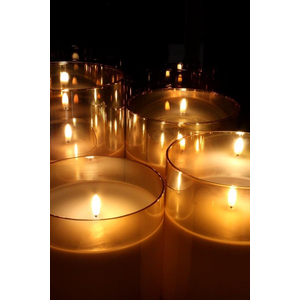– Elegantly set in shimmering metallic glass vessels that beautifully reflect the wick and amplify the glow