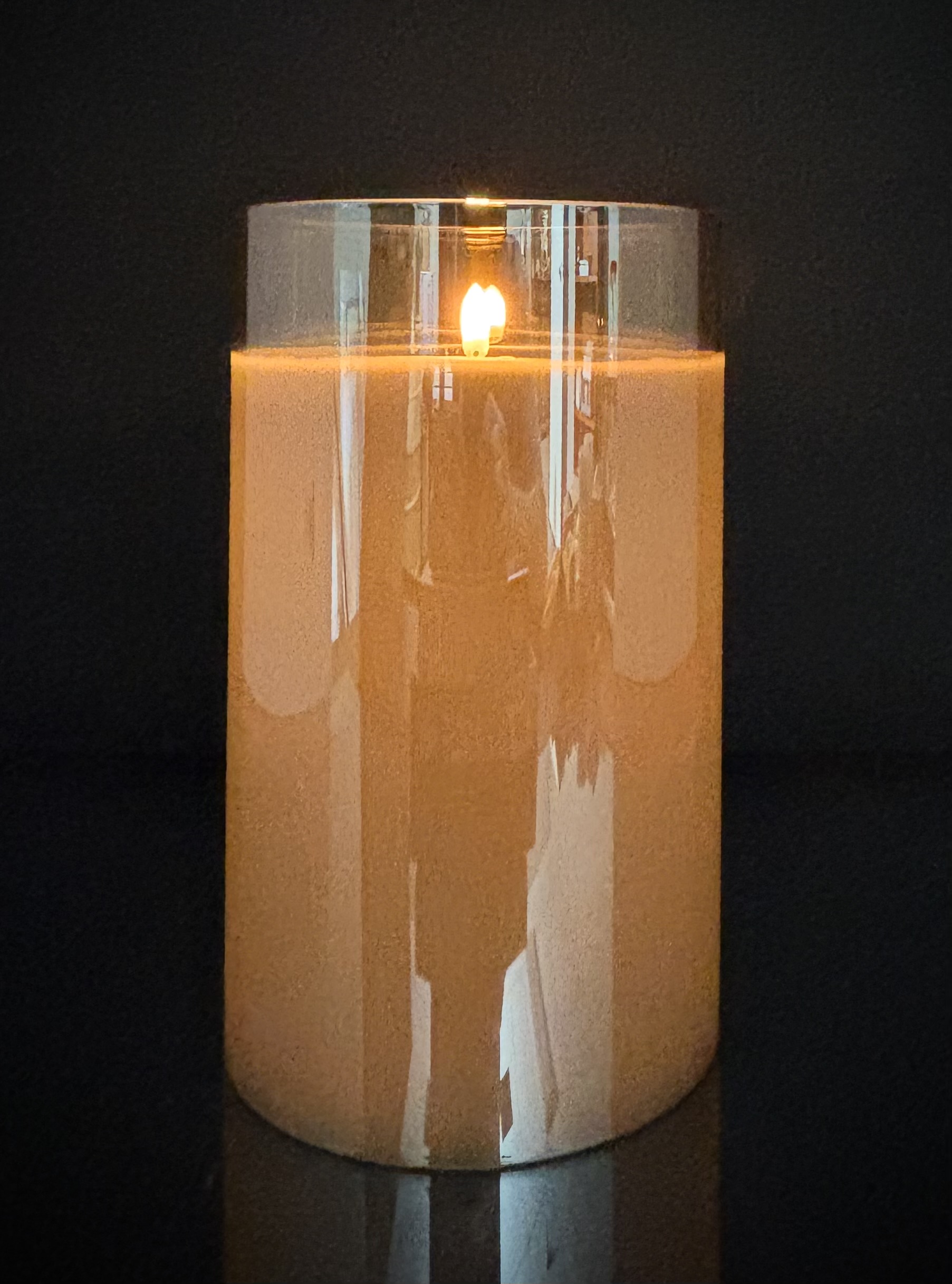 Champagne-colored glass surround reflects the wick, enhancing the glow