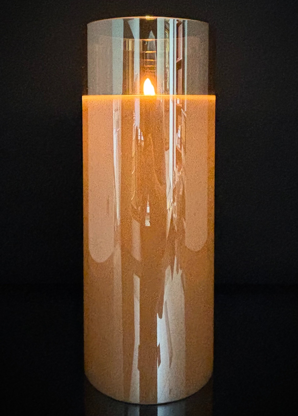 Champagne Radiance LED candles are made of 100% paraffin wax, poured into shimmering metallic glass vessels. The LED flame technology creates an incredibly realistic and subtle flicker which glows 250 hours per set of AA batteries. Set the convenient 6 hour reoccurring timer or operate via the optional remote control, sold separately. The 15″ tall Empire candle makes a statement as a stand alone design element, but is also perfect for filling oversized lanterns and hurricanes.