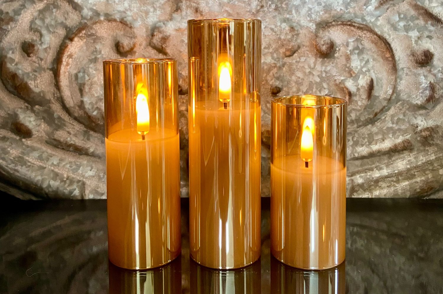 Champagne-colored glass surround reflects the wick, enhancing the glow