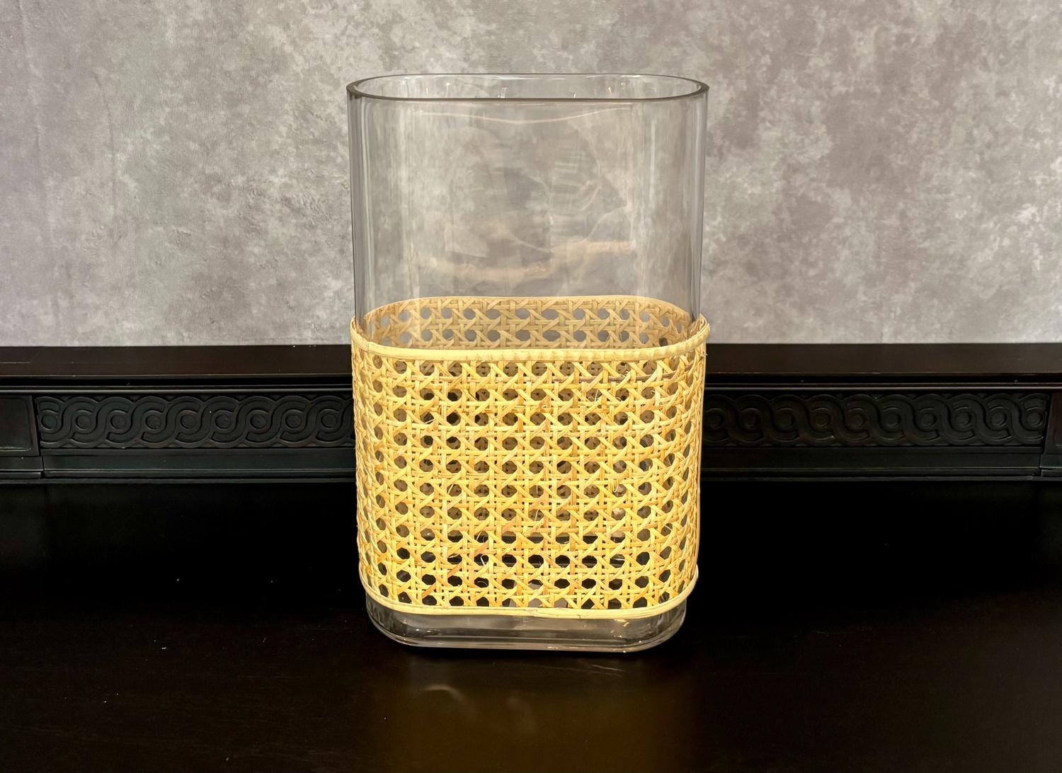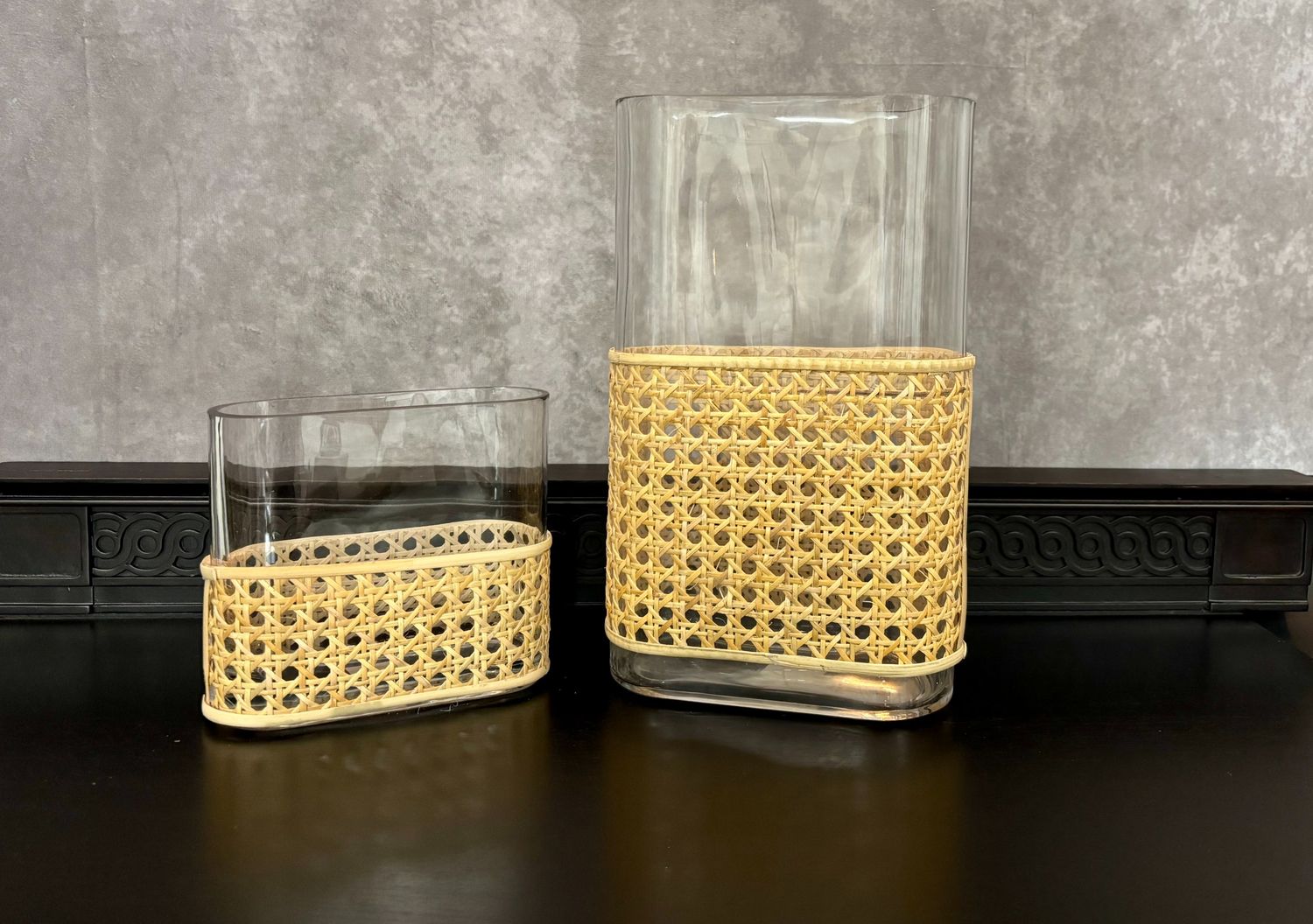 Elevate your space with the understated elegance of the Woven Whisper Vase. This narrow, clear glass vase is encased in a natural woven rattan sleeve, blending transparency with organic texture for a warm, sophisticated look. Perfect for single stems, dried florals, or minimalist arrangements, it brings a serene, modern-rustic touch to tabletops, shelves, or mantels. Lightweight yet refined, it complements both contemporary and coastal-inspired interiors.